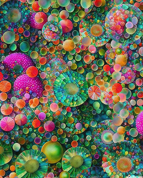 Bubbly shapes meld and collide into one another in a vibrant expression of spherical beauty. Digitally printed, larger shapes are about 2-1/4", from the 'Bubblelicious' collection by Hoffman Fabrics.