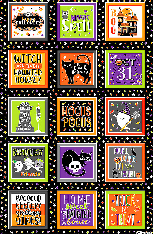 Spooky Halloween blocks are stacked on this fun, frightening panel, making it an essential for the Halloween season! 24" panel, panel has fifteen frames about 6-3/4" x 6-1/2", with glow-in-the-dark, 'Glow-O-Ween Boxes' from the 'Glow-O-Ween' collection by Kanvas Studio for Benartex Fabrics. This image has been divided and stacked vertically to display the entire panel.