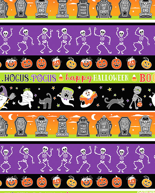 Dancing skeletons, party pumpkins, ghostly trick-or-treaters, and gravestones all alternate with vibrant spooky colors to make this essential Halloween stripe! Wider stripes are about 2-5/8", stripes run the length of the fabric, with glow-in-the-dark, 'Haunted Stripe' from the 'Glow-O-Ween' collection by Kanvas Studio for Benartex Fabrics.
