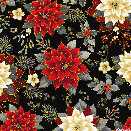 Flourishing poinsettia flower blossoms bring a festive air to this elegant Christmas-themed design. Larger poinsettias are about 3-1/2", with gold metallic, 'Holiday Garden' from the 'Holiday Tidings' collection by Kanvas Studio for Benartex Fabrics.
