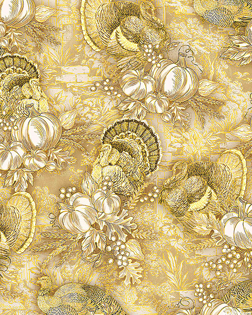 A happy harvest scene comes to life in a unique faux-toile style featuring imagery of turkeys, pumpkins, and bountiful crops aplenty. Larger turkeys are about 2-1/2", with gold metallic, 'Harvest Toile' from the 'Harvest Festival' collection by Kanvas Studio for Benartex Fabrics.