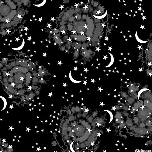 Crescent moons are scattered across the sky with small stars tossed in the space between. Larger crescent moons are about 1/2", with glow-in-the-dark, 'Starry Sky' from the 'Happy Hauntings' collection by Kanvas Studio for Benartex Fabrics.