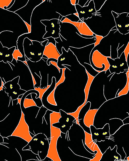Black cats accented with glow-in-the-dark lend a festive flair to this Halloween-themed design. Larger cats are about 5", with glow-in-the-dark, 'Cat Magic' from the 'Happy Hauntings' collection by Kanvas Studio for Benartex Fabrics.
