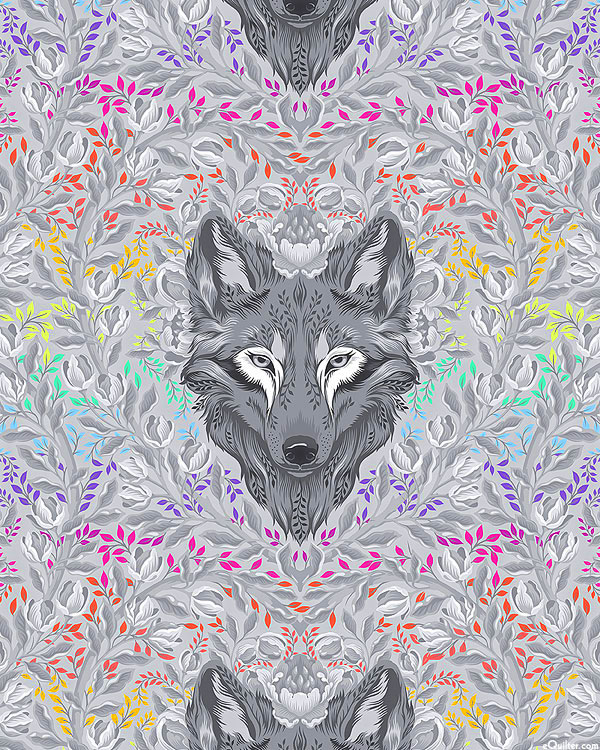 Grayscale wolves are surrounded by a lush garden accented by a vibrant spectrum of colorful leaves. Wolves are about 6-1/4", 'Wolf of Pink Street' from the 'Graywork' collection by Tula Pink for Free Spirit Fabrics.