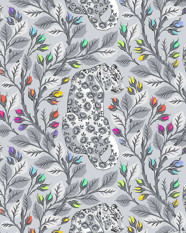 Grayscale leopards patterned with flowery spots are surrounded by a verdant jungle accented with a vibrant spectrum of flower buds. Leopards are about 6-1/2", 'Beautymark' from the 'Graywork' collection by Tula Pink for Free Spirit Fabrics.