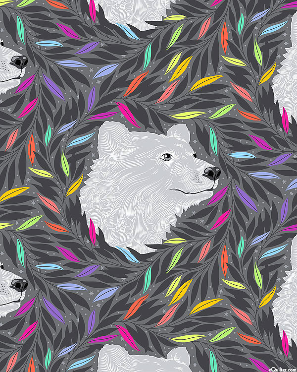 Grayscale bears are surrounded by a verdant forest accented by a vibrant spectrum of colorful leaves. Bears are about 4", 'Just Bearly' from the 'Graywork' collection by Tula Pink for Free Spirit Fabrics.
