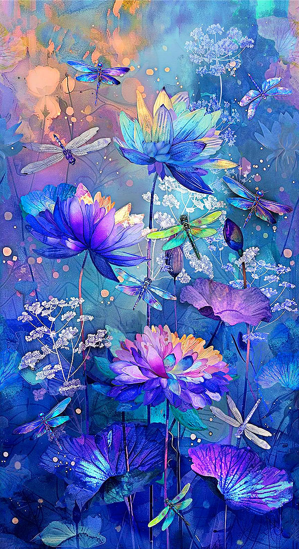 In this panel, dragonflies flutter to and fro between a lush water garden full of lotus florals and lily pads. Digitally printed, 24" panel, from the 'Dragonfly Mist' collection by Timeless Treasures.