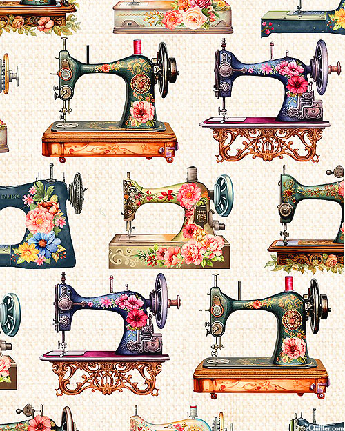 A colorful assortment of various vintage sewing machines decorated in bold blossoms lend a retro charm to this delightful design. Digitally printed, larger sewing machines are about ", 'Floral Sewing Machines' from the 'Happy Place' collection by Timeless Treasures.