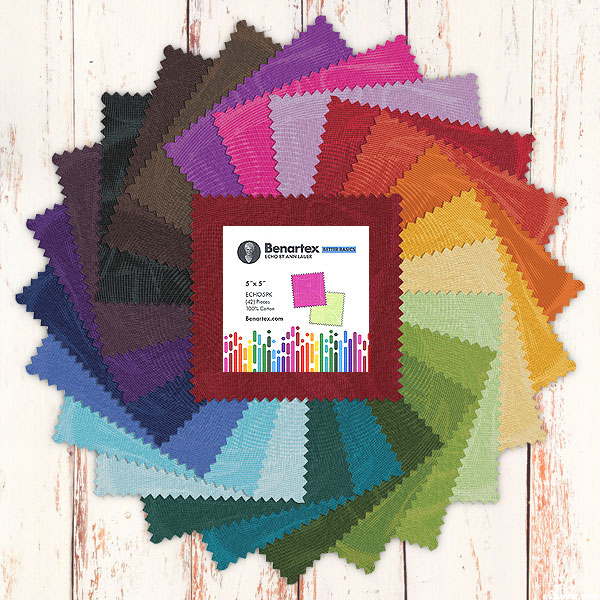Rippling textures are presented in a variety of vivid colors, making a versatile pre-cut that can be used in a wide array of projects! 'Echo' collection charm pack by Ann Lauer for Benartex Fabrics, pack includes forty-two 5" x 5" squares.