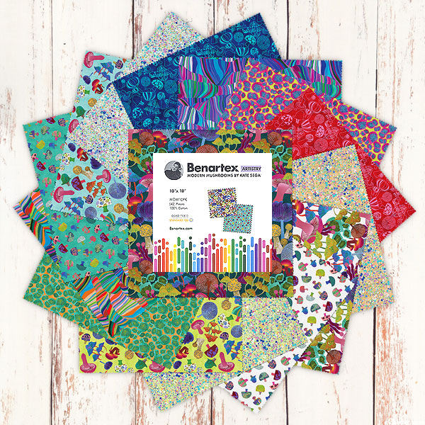 A groovy mix of abstract patterns and forest fungi are presented in a vibrant variety of vivid colors, making a versatile pre-cut that can be used in a wide array of projects! 'Modern Mushrooms' collection ten-square by Kate Segal for Benartex Fabrics. Pack includes forty-two 10" x 10" squares.