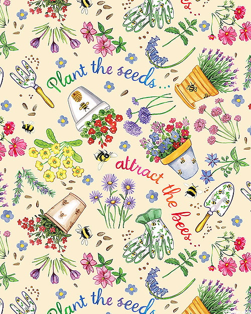 Honeybees and garden flowers are tossed across the design with phrases related to gardening tossed in the space between. Digitally printed, larger potted plants are about 2-1/2", 'Plant The Seeds' from the 'Meant To Bee' collection by Louise Nisbet for Michael Miller Fabrics.