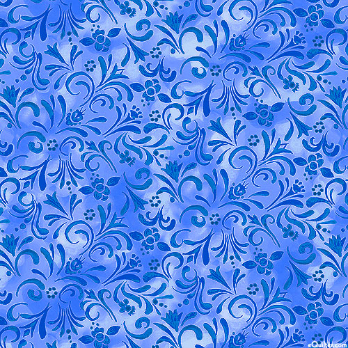 Elegant scrolling featuring floral filigree spans this tranquil tonal design. Larger flowers are about 1/2", 'Shorelights Scroll' from the 'All Hallows' Eve' collection by Jim Shore for Benartex Fabrics.