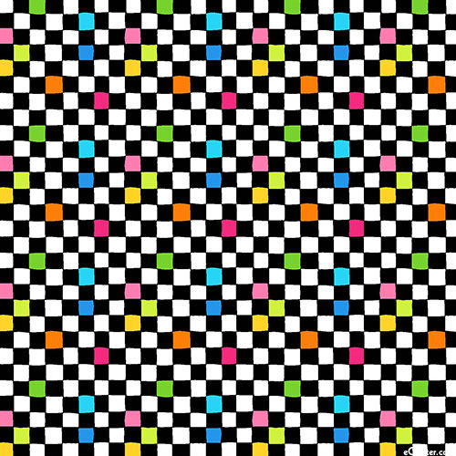A checkerboard pattern is articulated by colorful squares scattered throughout. Digitally printed, squares are about 3/16", 'Mod Check' from the 'Yesteryear' collection by MK Surface for Michael Miller Fabrics.