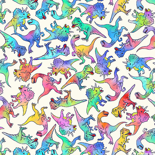 A colorful assortment of dinosaurs are scattered all over this energetic design. Digitally printed, larger dinosaurs are about 1-5/8", 'Rainbow Dinosaur' from the 'Dino Pizza Party' collection by Michael Miller Fabrics.
