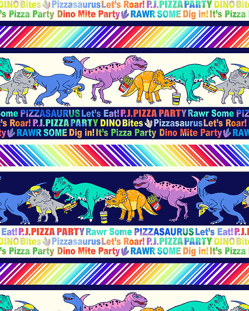 Dinosaurs gather together for a prehistoric party as they feast on tasty foods including pizza, burgers, fries, and hot dogs. Digitally printed, wider stripes are about 2-1/2", stripes run the length of the fabric, 'Dino Pizza Party Stripe' from the 'Dino Pizza Party' collection by Michael Miller Fabrics.