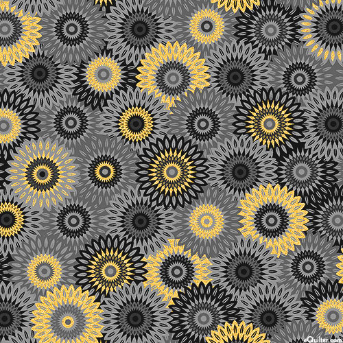 Elegant medallions layered atop one another are neatly arranged into rows across the design. Larger medallions are about 1-1/4", with gold metallic, 'Fancy Medallion' from the 'Magnificent Peacock' collection by Michael Miller Fabrics.