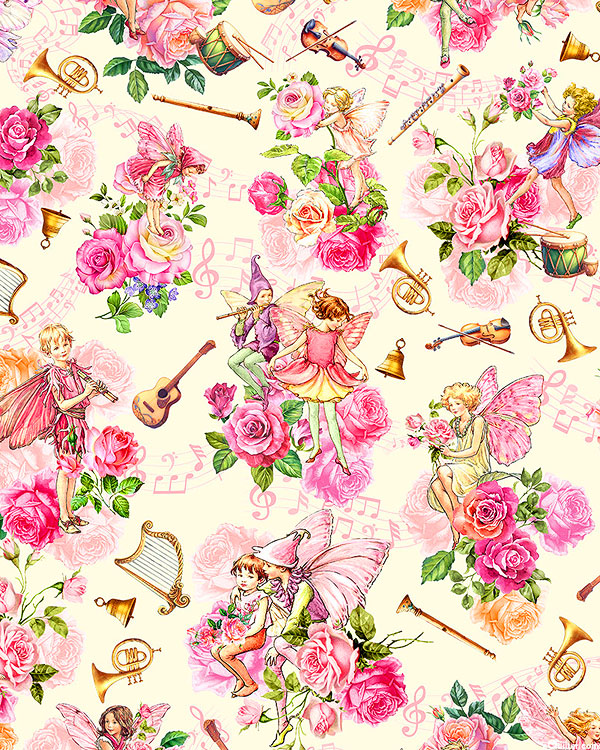 Fantastical fairies dance and play music together as a lush landscape of florals and musical notes lend a magical charm to the design. Digitally printed, larger fairies are about 5-3/4", 'Spring Songs Fairy Bouquet' from the 'Spring Songs Flower Fairies' collection by The Estate of Cicely Mary Barker for Michael Miller Fabrics.