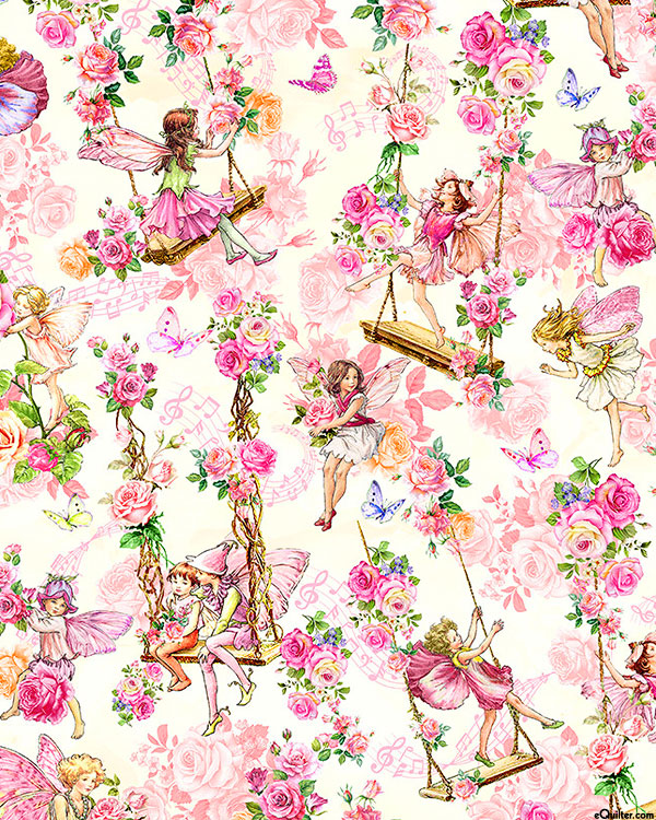 Fantastical fairies dance and play on forest swings as a lush landscape of butterflies, florals, and musical notes lend a magical charm to the design. Digitally printed, larger fairies are about 3-1/2", 'Garden Swings' from the 'Spring Songs Flower Fairies' collection by The Estate of Cicely Mary Barker for Michael Miller Fabrics.