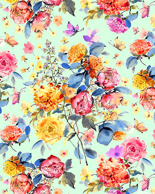 Butterflies and garden florals coalesce to create a dreamy landscape of lush and verdant elegance. Digitally printed, larger flowers are about 2", 'Primrose Bouquet' from the 'Primrose Garden' collection by Michael Miller Fabrics.