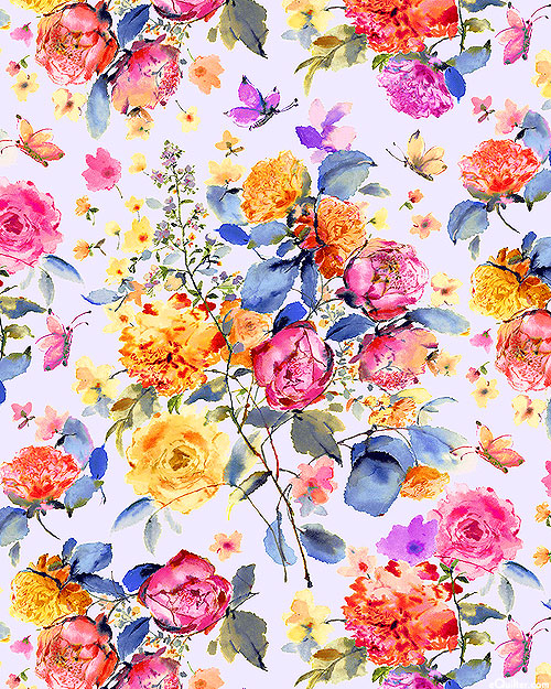 Butterflies and garden florals coalesce to create a dreamy landscape of lush and verdant elegance. Digitally printed, larger flowers are about 2", 'Primrose Bouquet' from the 'Primrose Garden' collection by Michael Miller Fabrics.