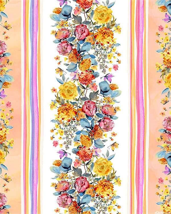 Butterflies and garden florals coalesce to create a dreamy landscape of lush and verdant elegance between the layers of this striped design. Digitally printed, wider stripes are about 5-1/2", stripes run the length of the fabric, 'Primrose Stripe' from the 'Primrose Garden' collection by Michael Miller Fabrics.