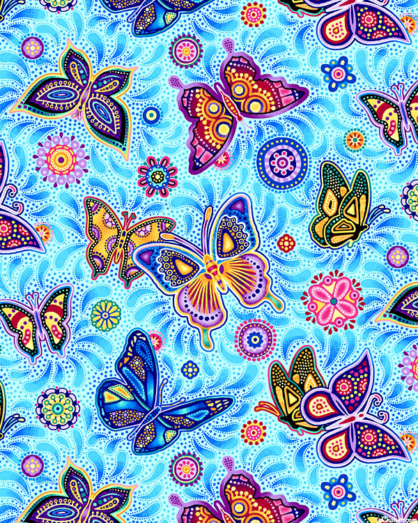 Butterflies in a wide variety of shapes, species and color fly over a speckled background in the style of a traditional dot-art painting. Larger butterflies are about 3", from the 'Pannotia' collection by Oasis Fabrics.