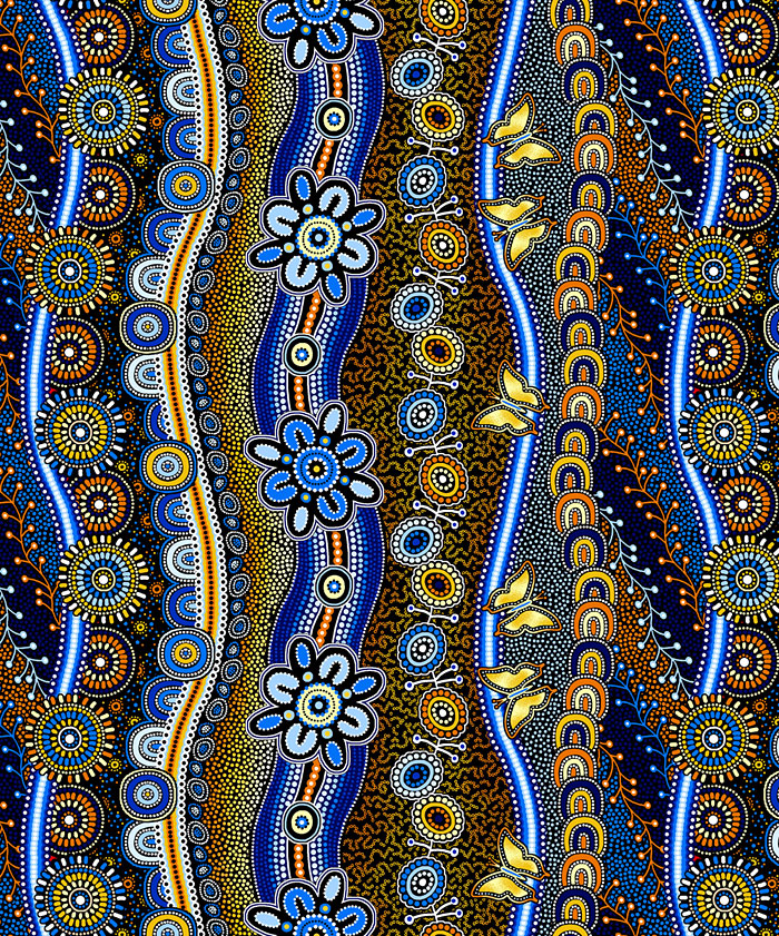 In the style of a traditional dot-art painting, flowers and golden butterflies are arranged over curving stripes of colors and patterns. Wider floral stripes are about 1-3/4", from the 'Pannotia' collection by Oasis Fabrics.