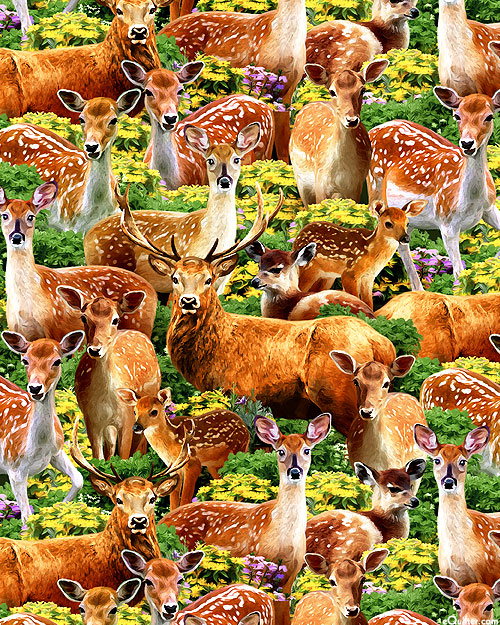 A herd of deer are seen gathered together proudly posed with their majestic antlers held high. Digitally printed, larger deer are about 4", from the 'Wilderness' collection by Oasis Fabrics.