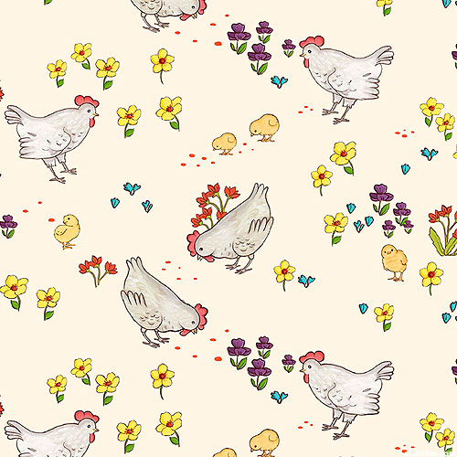 Mother hens and their baby chicks strut their stuff across a flowery field in the countryside. Digitally printed, larger chickens are about 1-1/4", 'Chicken Farm' from the 'Farm Days' collection by Belle & Boo Out To Play for Michael Miller Fabrics.