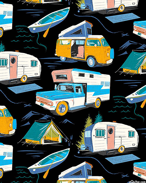 Campers and boats depicted in a unique retro style lend a vintage charm to this outdoorsy design. Digitally printed, larger vehicles are about 3-1/2", 'Road Trip Vehicles' from the 'Retro Road Trip' collection by Michael Miller Fabrics.