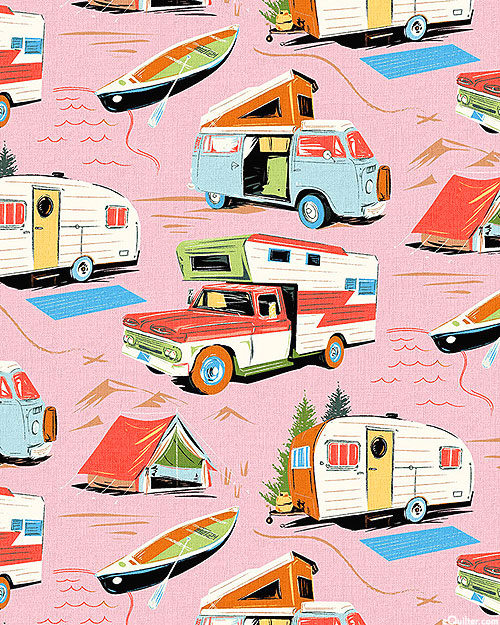 Campers and boats depicted in a unique retro style lend a vintage charm to this outdoorsy design. Digitally printed, larger vehicles are about 3-1/2", 'Road Trip Vehicles' from the 'Retro Road Trip' collection by Michael Miller Fabrics.