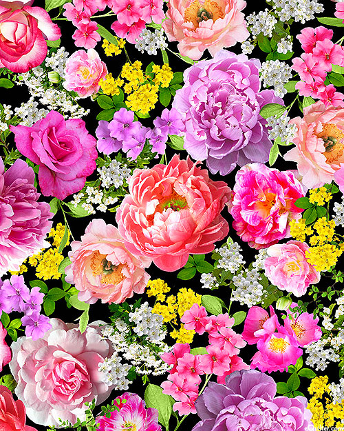 A lush landscape of flourishing flowers coalesce to create a captivating garden gala of texture and tone. Digitally printed, larger flowers are about 4", 'Flower Splendor Bouquet' from the 'Floral Splendor' collection by Michael Miller Fabrics.