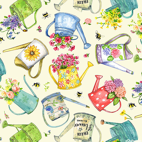 Honeybees buzz between watering cans holding bright bouquets of flowers in this charming garden-themed design. Digitally printed, larger watering cans are about 2-1/4", 'Watering Cans' from the 'Meant To Bee' collection by Louise Nisbet for Michael Miller Fabrics.
