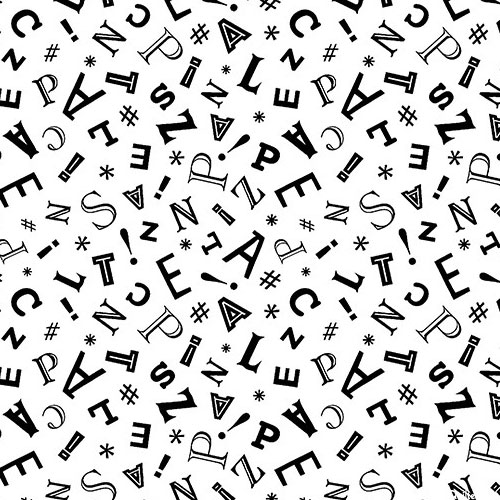 Letters of the alphabet and punctuation marks are tossed against a solid textured background. Digitally printed, larger letters are about 1/2", 'Too Many Thoughts' from the 'Insomnia' collection by Michael Miller Fabrics.