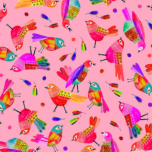 A cozy congregation of colorful songbirds gather together to show off the elegant patterns of their beautiful feathers. Digitally printed, larger birds are about 2", 'Pom Pom Songbird' from the 'Songbird Garden' collection by Katherine Herrell for Michael Miller Fabrics.