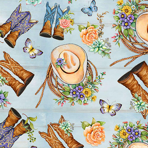 Western motifs such as cowboy boots and hats are accented with lush florals and fluttering butterflies across this charming design. Larger cowboy hats are about 1-3/4", 'Tossed Boots' from the 'Highland Ranch' collection by Susan Winget for Springs. Sold for noncommercial home use only. Other uses prohibited.