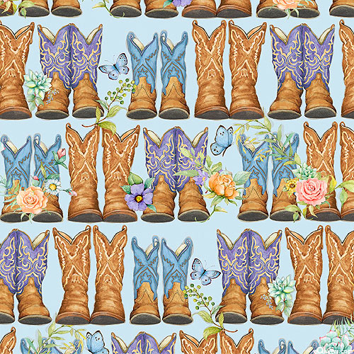 Colorful cowboy boots are neatly arranged into rows with accenting florals and butterflies. Larger cowboy boots are about 2", 'Dusty Boots' from the 'Highland Ranch' collection by Susan Winget for Springs. Sold for noncommercial home use only. Other uses prohibited.