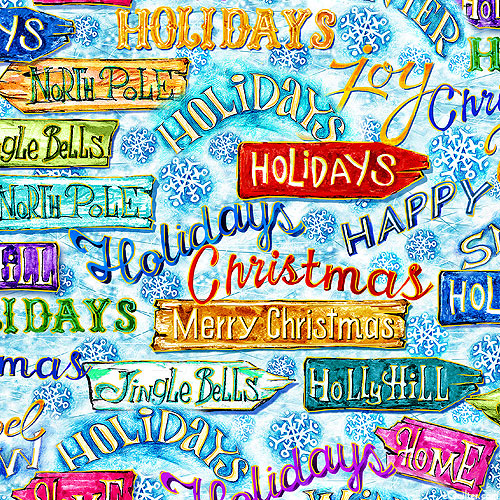 Bright Christmas-themed signs are tossed against a background of wintry snowflakes in this fun and festive design. Digitally printed, larger signs are about 3-5/8", from the 'Noel' collection by Oasis Fabrics.