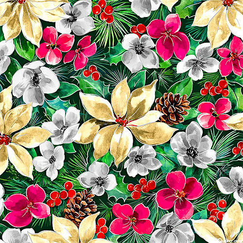 Pine cones and winter florals are tossed across the design in a festive flurry of holiday charm. Digitally printed, larger flowers are about 3", from the 'Noel' collection by Oasis Fabrics.