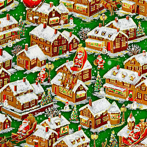 An adorable Christmas village composed of gingerbread houses comes to life as a small Santa Claus and his reindeer are seen delivering presents from house to house. Digitally printed, larger houses are about 1-1/2", from the 'Noel' collection by Oasis Fabrics.