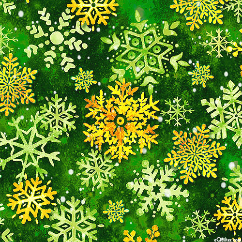 Small snowflakes fall through the air in a festive flurry of Christmas charm. Digitally printed, larger snowflakes are about 1-1/4", from the 'Noel' collection by Oasis Fabrics.