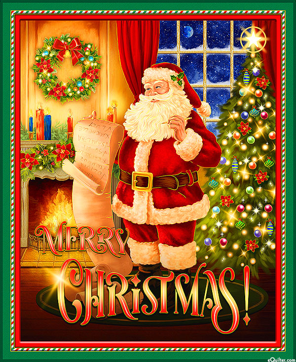 In this panel, a jolly Santa Claus checks his list of good children a second time as a cozy Christmas scene unfolds in the background. Digitally printed, 34" panel, from the 'Noel' collection by Oasis Fabrics.
