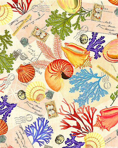Seashells, kelp and compasses are scattered all over this nautical-themed print. Digitally printed, larger objects are about 3", 'Coastal Holiday' from the 'Seaing' collection by Michael Miller Fabrics.