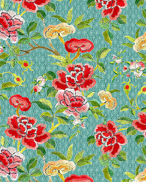Lush florals depicted in an embroidered style evoke a calming elegance across this charming print. Digitally printed, larger flowers are about 2", 'Camellia Blossom' from the 'Silk Road' collection by Bloomery Decor for Michael Miller Fabrics.