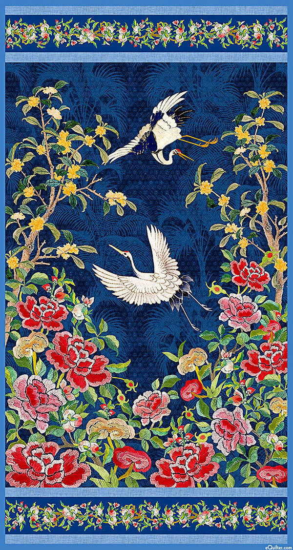 Elegant cranes swoop low above a blossoming garden full of flowers in this enchanting Asian-themed design. Digitally printed, 24" panel, 'Silk Road Panel' from the 'Silk Road' collection by Bloomery Decor for Michael Miller Fabrics.