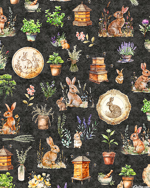 A wholesome garden scene comes to life as beehives and bunny rabbits buzz and frolic amidst a lush landscape of florals and shrubs. Digitally printed, larger bunnies are about 2-1/2", from the 'Hunny Bunny' collection by Dan Morris for Quilting Treasures.