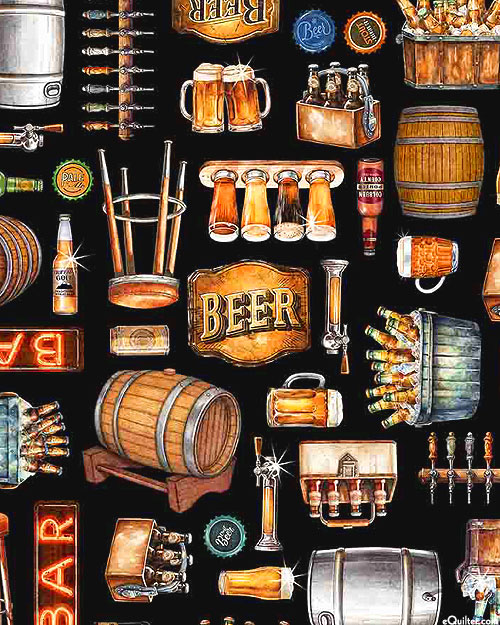 A colorful assortment of beer-themed motifs are depicted across the design including ale mugs, beer bottles, bar stools, beer casks, beer taps, and bar signs. Digitally printed, larger objects are about 3-1/4", from the 'Brewmaster' collection by Dan Morris for Quilting Treasures.