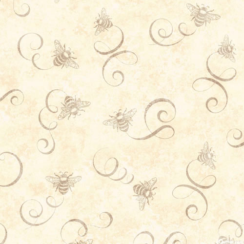 Queen bees soar through the air in a buzzing dance against a gently mottled background. Digitally printed, larger bees are about 1", from the 'Queen Bee' collection by Dan Morris for Quilting Treasures.
