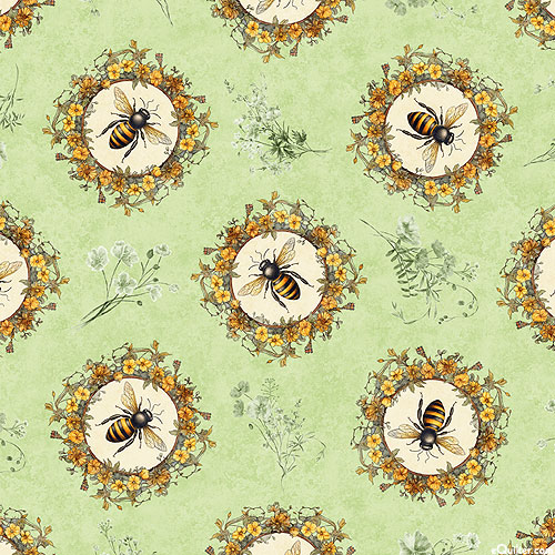 Floral wreaths containing honeybees are arranged into a grid with sprigs of wildflowers tossed between. Digitally printed, larger wreaths are about 3-1/2", from the 'Queen Bee' collection by Dan Morris for Quilting Treasures.