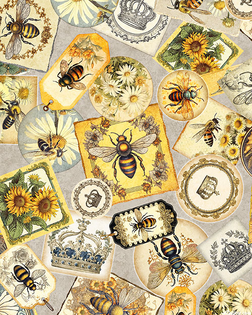 An assortment of badges and tags contain imagery of honeybees, garden scenery, and royal crowns. Digitally printed, larger postcards are about 3-1/2", from the 'Queen Bee' collection by Dan Morris for Quilting Treasures.